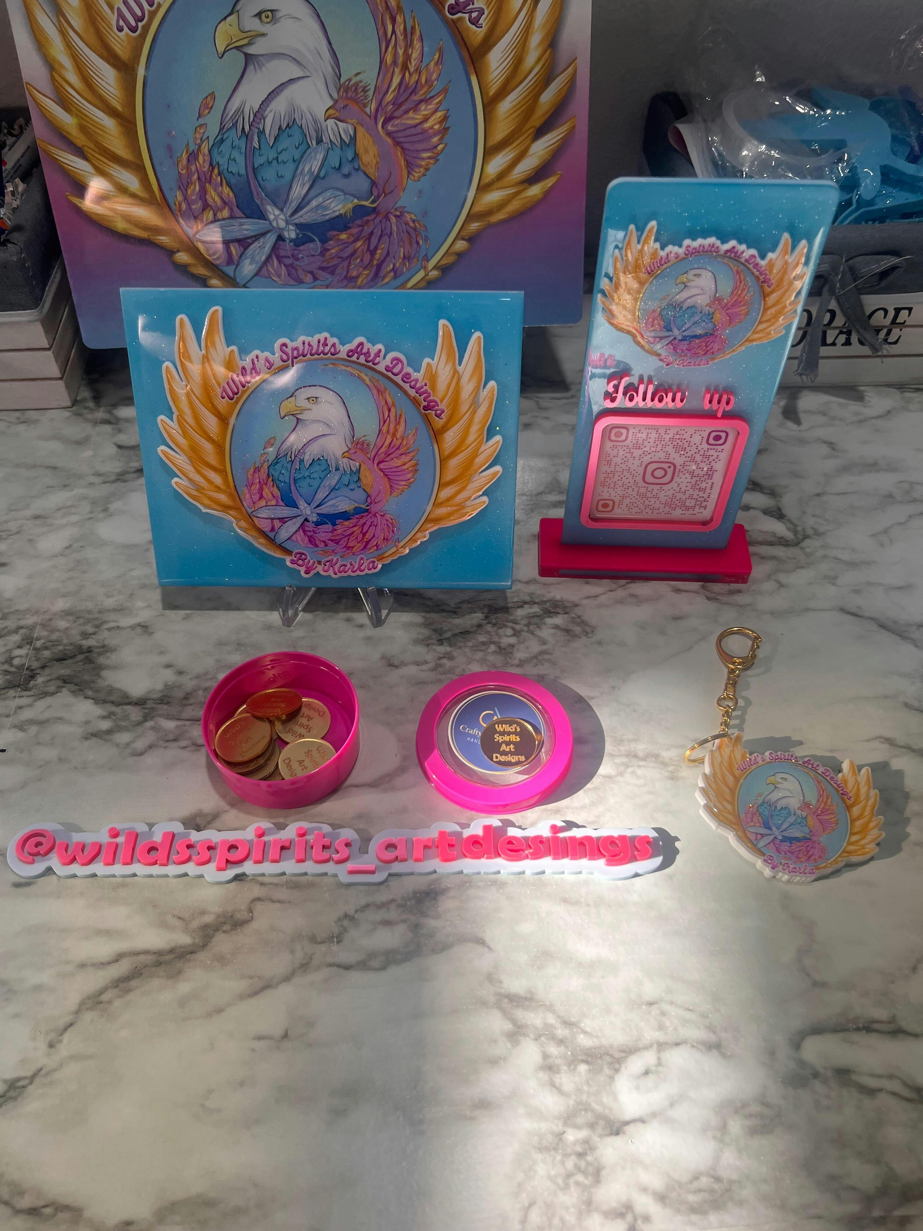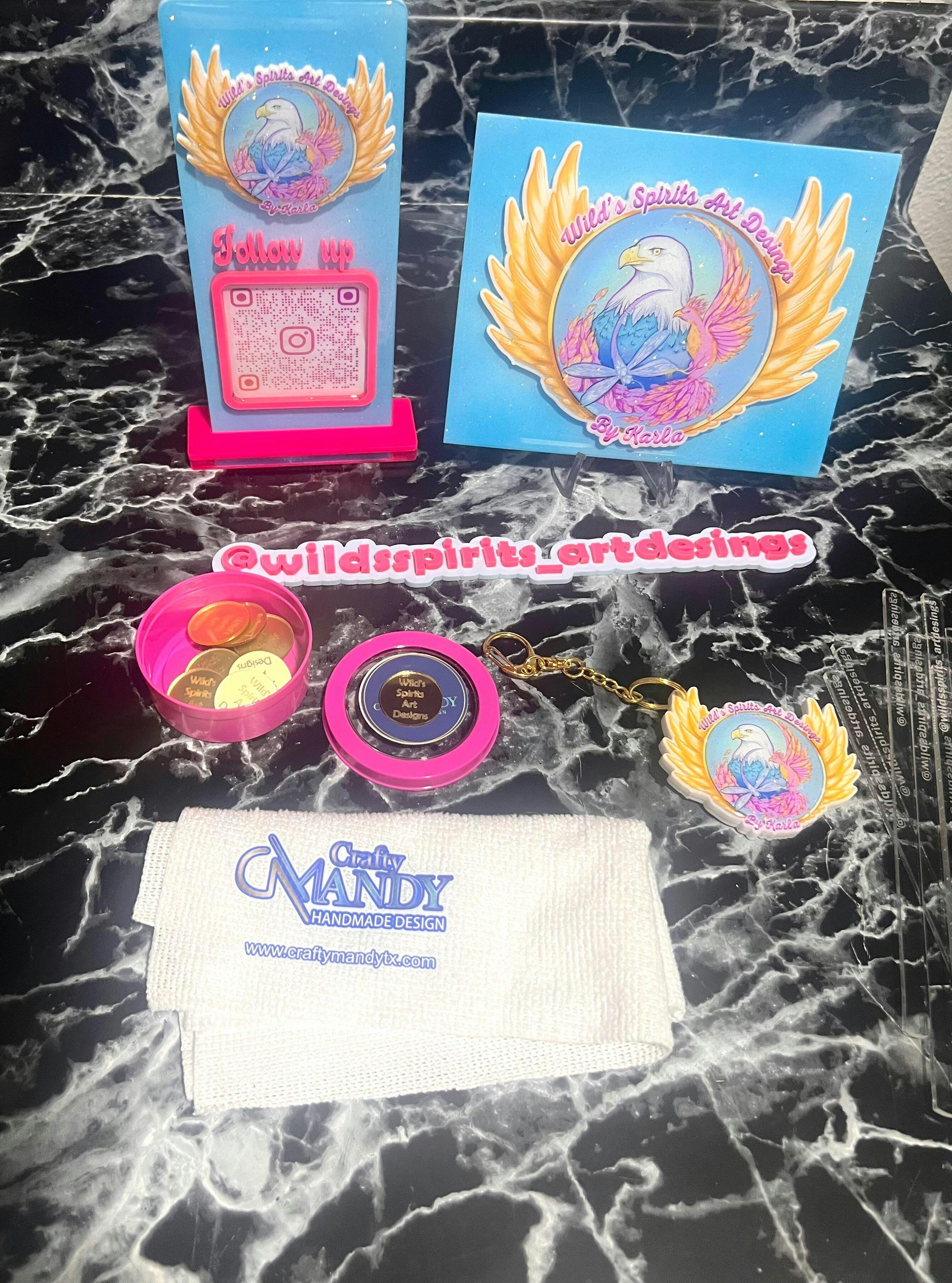 Cada pieza está hecha a mano con materiales de alta calidad como resina y acrílico, personalizándose completamente con tu logotipo, colores y estilo. Perfecto para emprendedores que buscan destacar su marca de forma creativa y profesional.