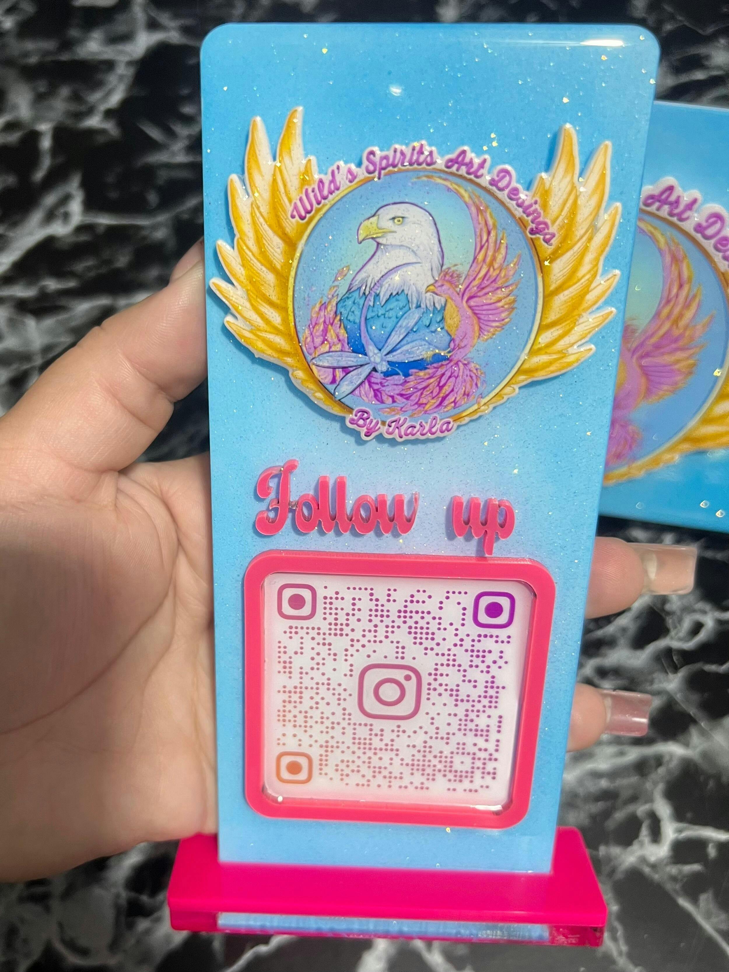 Stand para Código QR: Ideal para facilitar que tus clientes accedan rápidamente a tus redes sociales o sitio web. Fabricado en resina con un diseño personalizado que refleja tu marca.